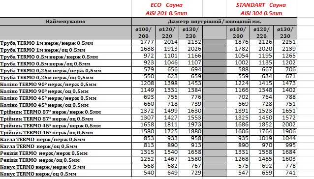 Используемые трубы имеют термоизоляционные свойства благодаря тому, что между внутренней трубой из нержавеющей стали и внешней крупно диаметровой трубой расположен термоизоляционный материал, устойчивый к воздействию высоких температур. Двустенные дымоходы для саун купить без всяких проблем и трудностей теперь Вы можете в нашем магазине, на сайте которого детально расписаны цены на элементы дымохода, трубы различных видов, толщины и диаметров.